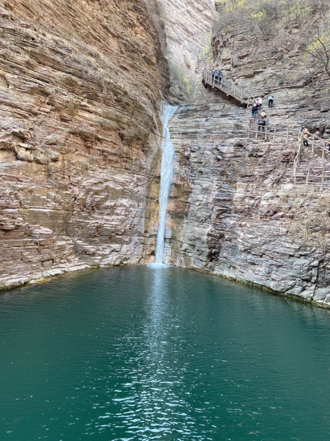 經(jīng)過一晚上的休息,第二天早上大家精神抖擻的趕到桃花谷景區(qū)。它是以山、谷、潭、洞為主的自然景區(qū)。因其“三九嚴(yán)寒桃花開,三伏酷暑水結(jié)冰和346米高亞洲高瀑布”而聞名于世。在往景區(qū)深處,隨著指引來(lái)到太行天路景區(qū)。太行天路景區(qū)位于太行山之巔,北起桃花谷景區(qū),南至仙霞谷景區(qū),全長(zhǎng)約30km,既是景區(qū)環(huán)線游覽道路的重要組成部分,更是俯瞰太行山壯美風(fēng)光的好位置。乘坐觀光車游走于太行天路,深邃的峽谷、直立的巖壁,帶給我們強(qiáng)烈的視覺震懾。